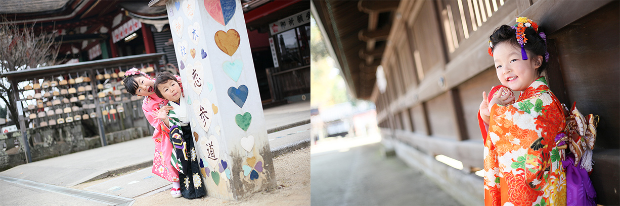 当店スタジオにて、着付け・ヘアメイクをいたします。女の子は髪飾りや小物をつけて、可愛くキレイに変身!